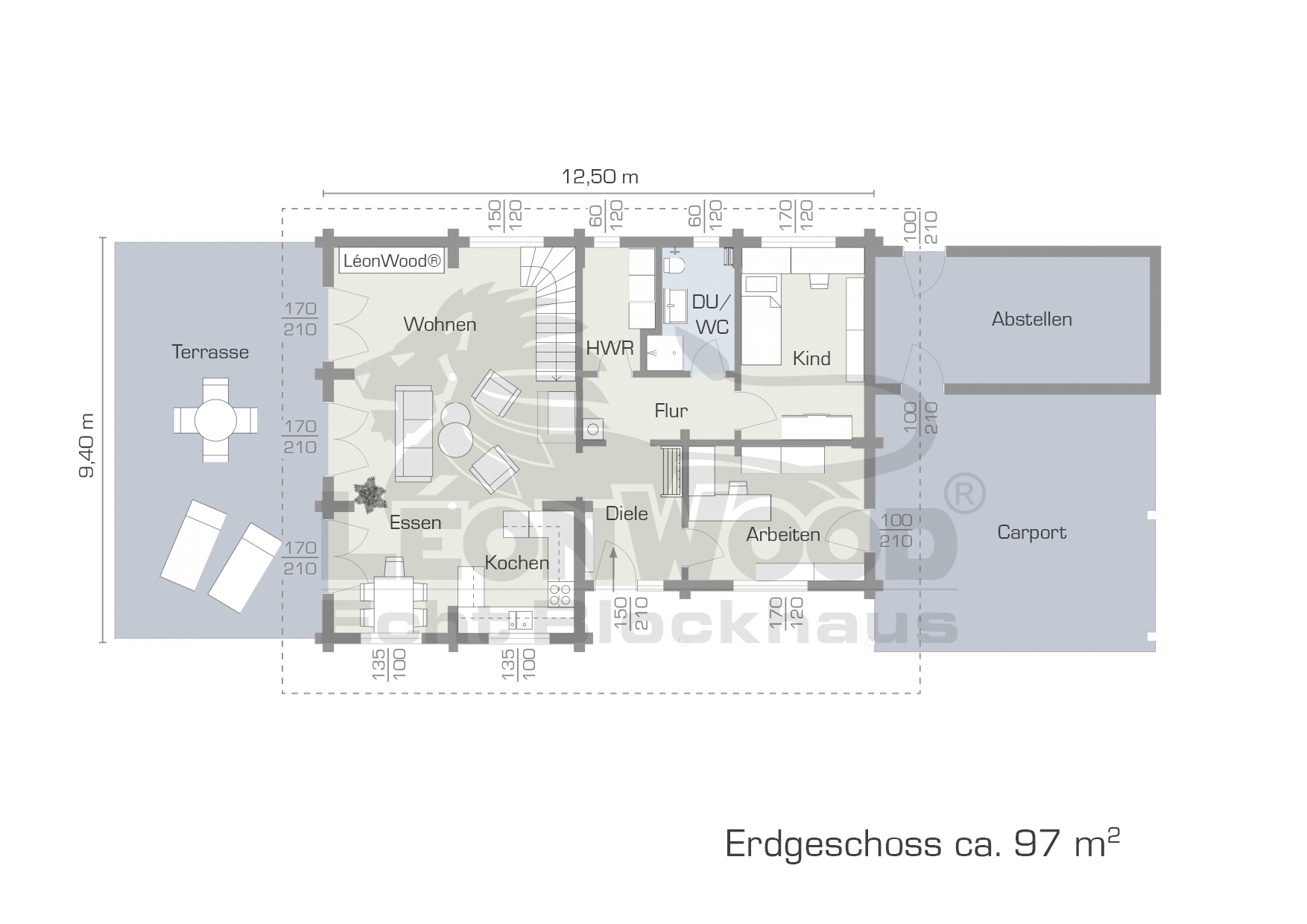 Beim Modell „Nordwind“ hat LéonWood® die besonders widerstandsfähige Polarkiefer in Rundstammbauweise verbaut – die Nordic*Round. Aufgrund der höheren Holzoberfläche der Rundstammwand gegenüber glatten Holzwänden, können sich die typischen wohngesunden Eigenschaften des Holzes noch besser entfalten. Die Blockhaus-Bewohner dürfen sich über ein gleichbleibend angenehmes Raumklima, unabhängig von der Jahreszeit, freuen.