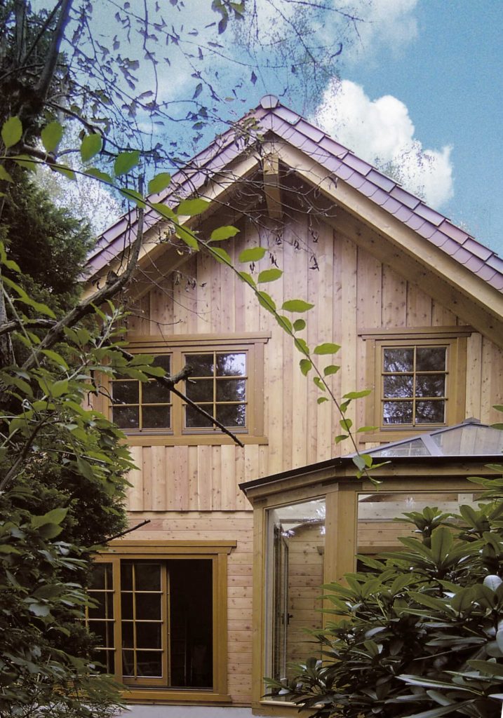 Kompaktes Landhaus mit Wintergarten, offener Wohn-/Essbereich auf zwei Ebenen, flexible Schlafraumgestaltung im Dachgeschoss, energieeffiziente BIO-Doppelwand® mit Korkdämmung.