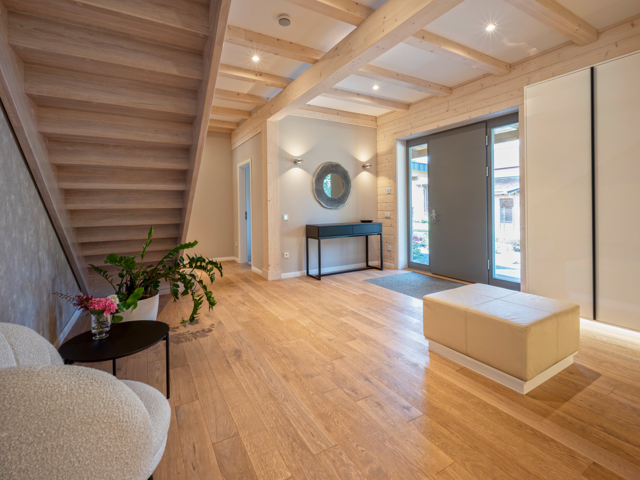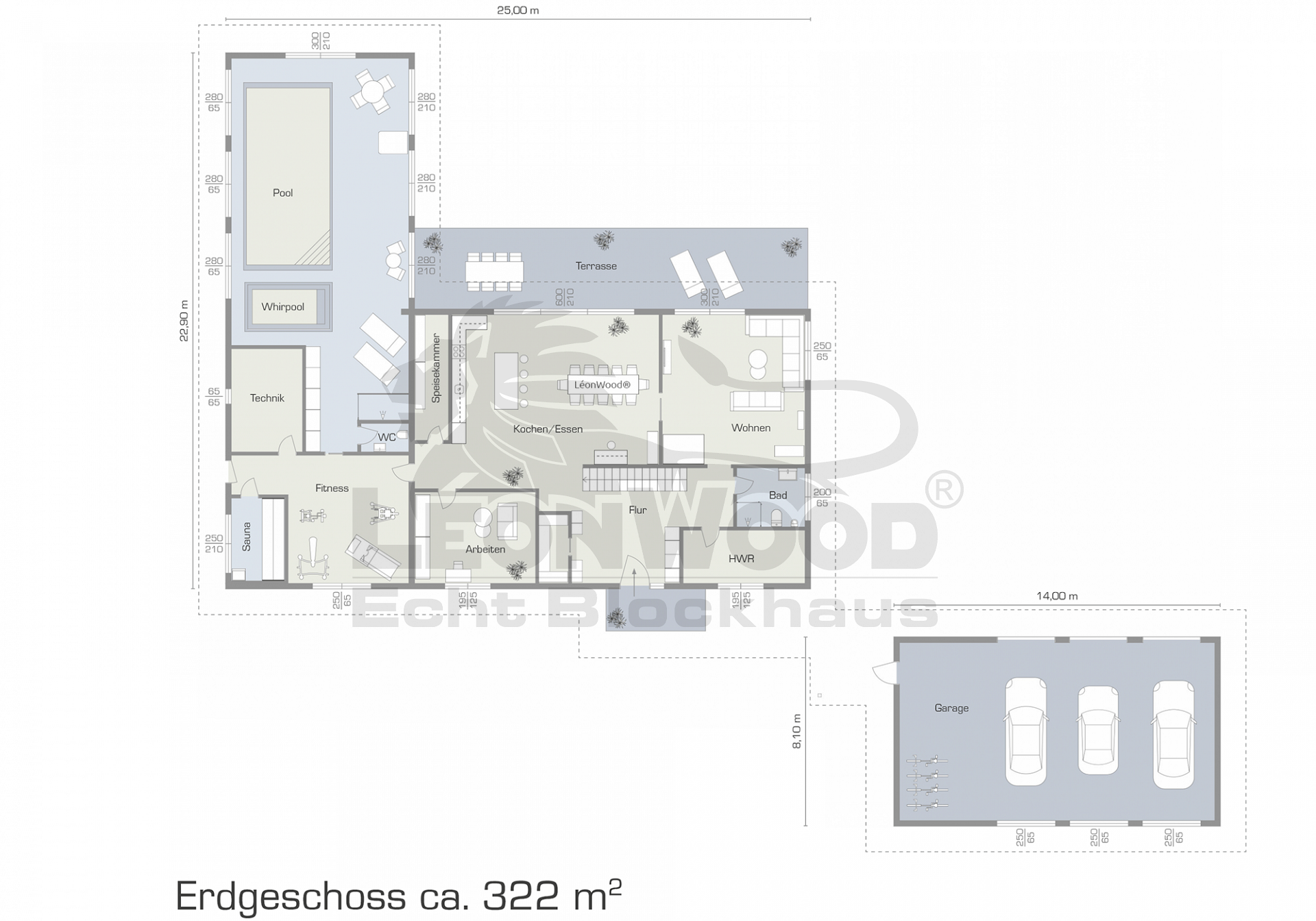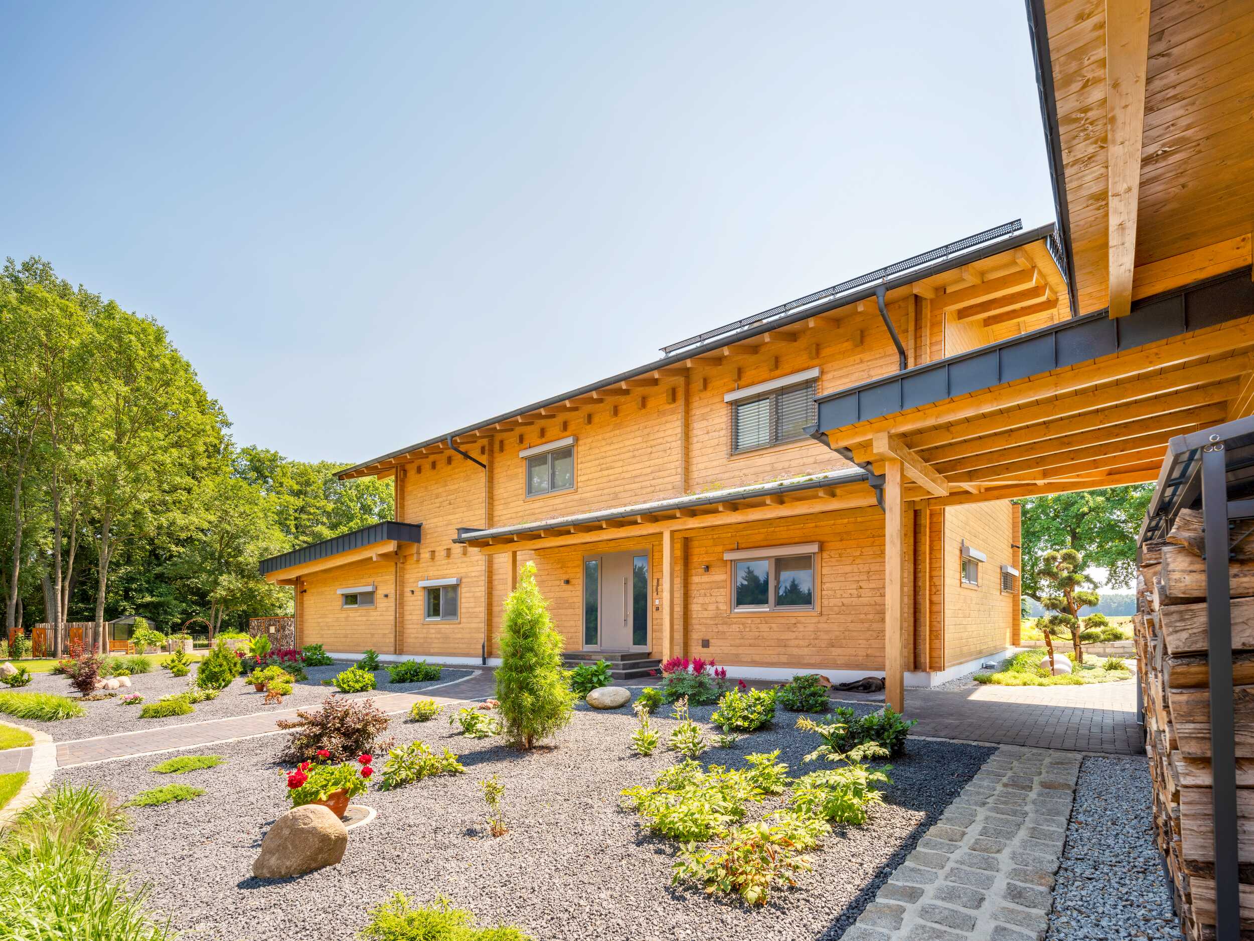Highlight ist der zirka 165m² große, ebenerdige Wellnessanbau mit Poolhaus, Gym und Sauna, der direkt an das Erdgeschoss angeschlossen wurde. Vervollständigt wird das Ensemble durch die Dreifachgarage mit Geräteraum, die über einen überdachten Steg mit dem Haupthaus verbunden ist. Das LéonWood®-Blockhaus „Residenz Alexandra“ steht für Luxus, ohne dabei protzig zu wirken. Eine Familien-Residenz der Extraklasse.
