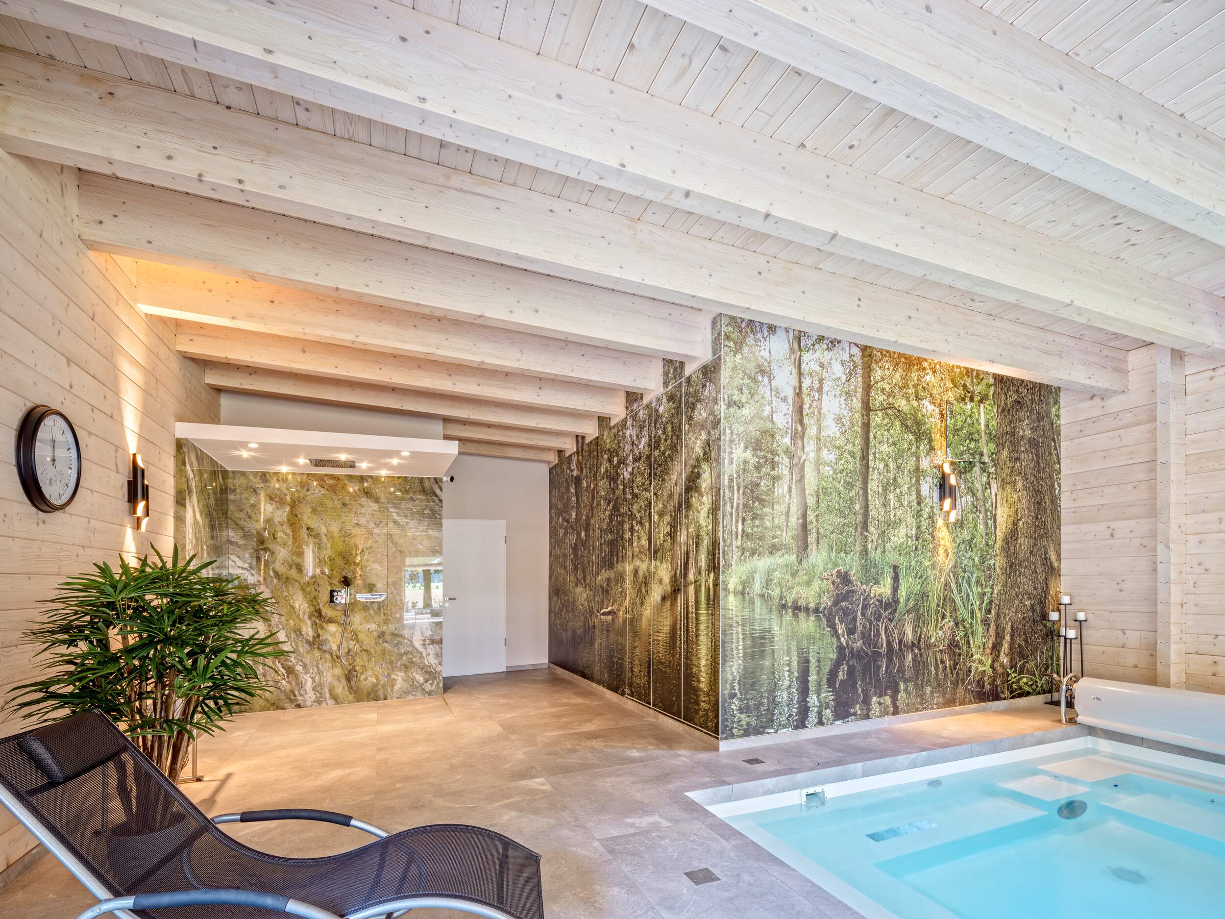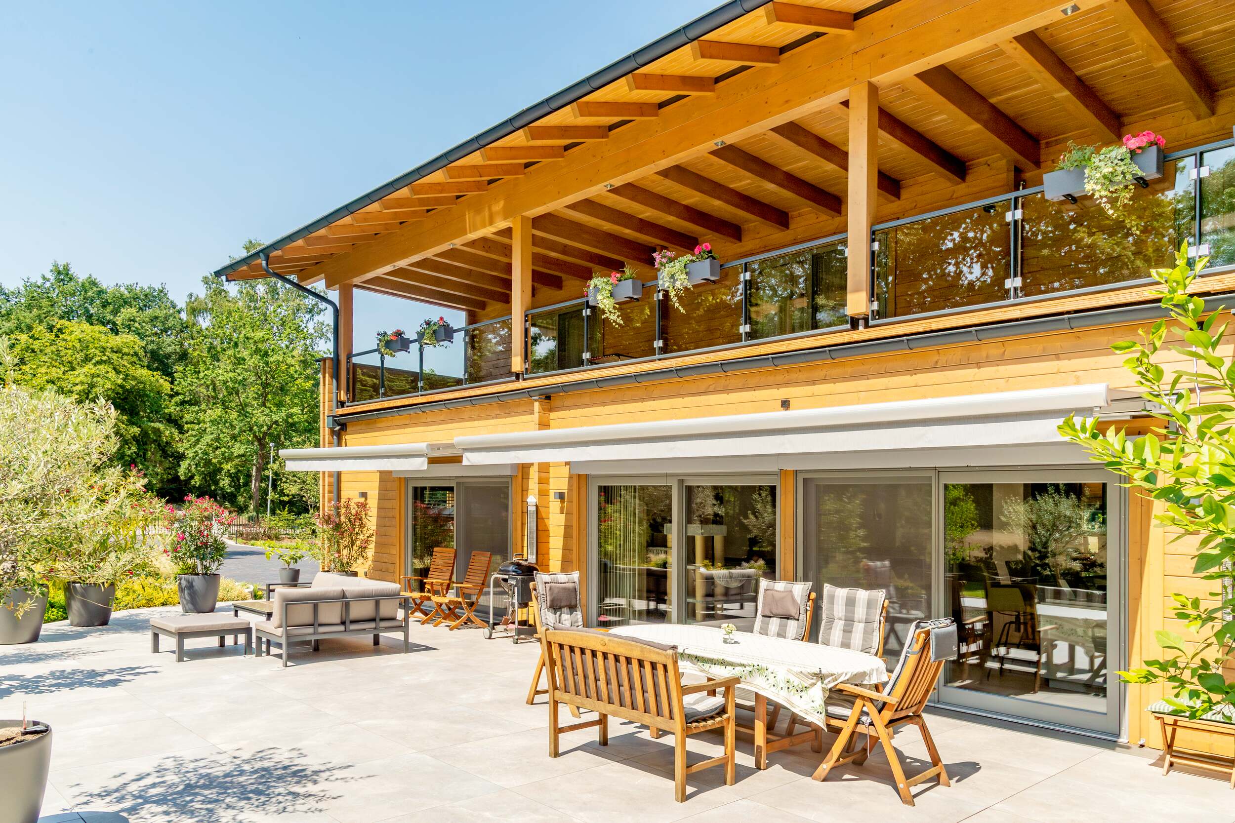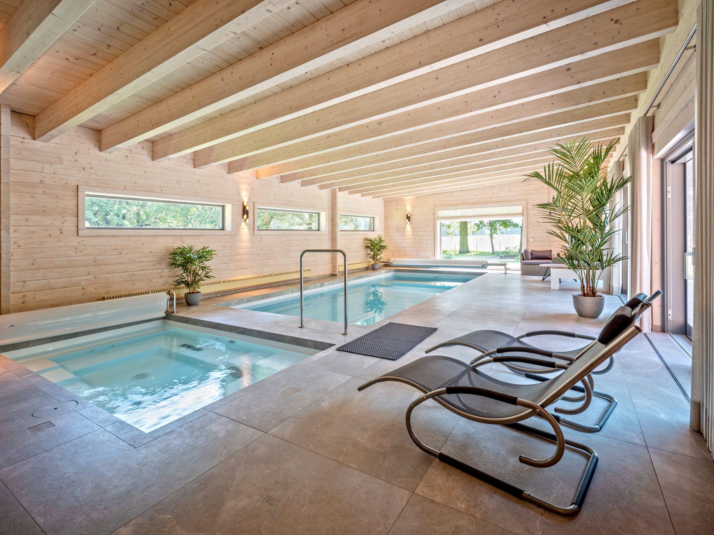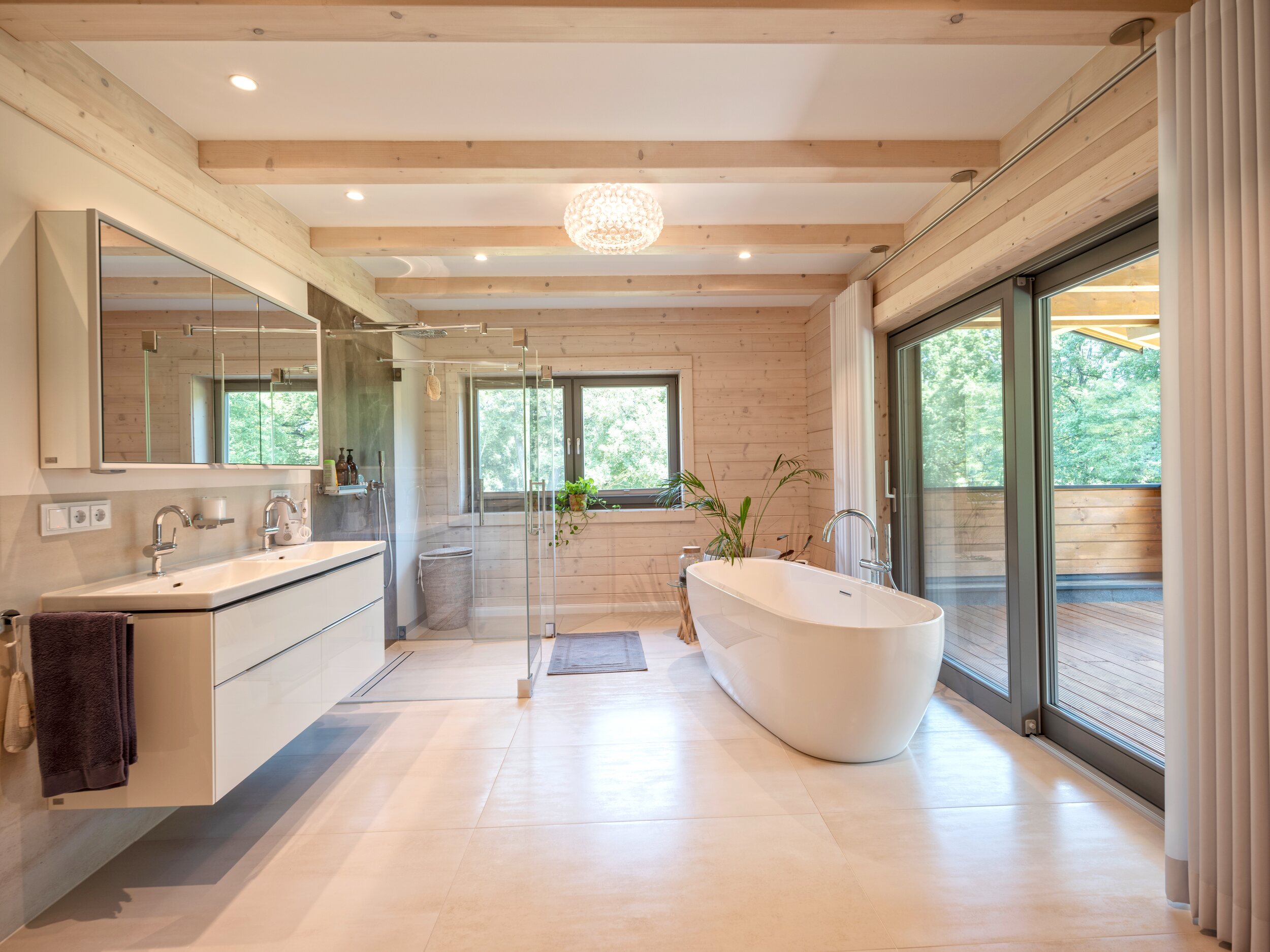 Highlight ist der zirka 165m² große, ebenerdige Wellnessanbau mit Poolhaus, Gym und Sauna, der direkt an das Erdgeschoss angeschlossen wurde. Vervollständigt wird das Ensemble durch die Dreifachgarage mit Geräteraum, die über einen überdachten Steg mit dem Haupthaus verbunden ist. Das LéonWood®-Blockhaus „Residenz Alexandra“ steht für Luxus, ohne dabei protzig zu wirken. Eine Familien-Residenz der Extraklasse.