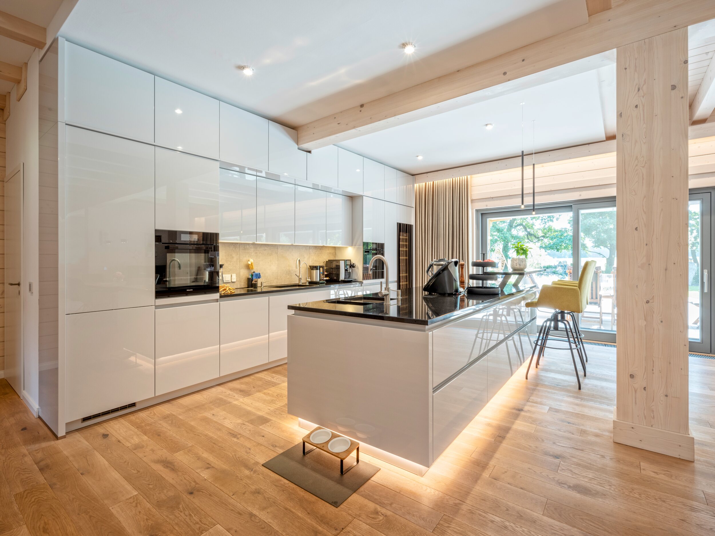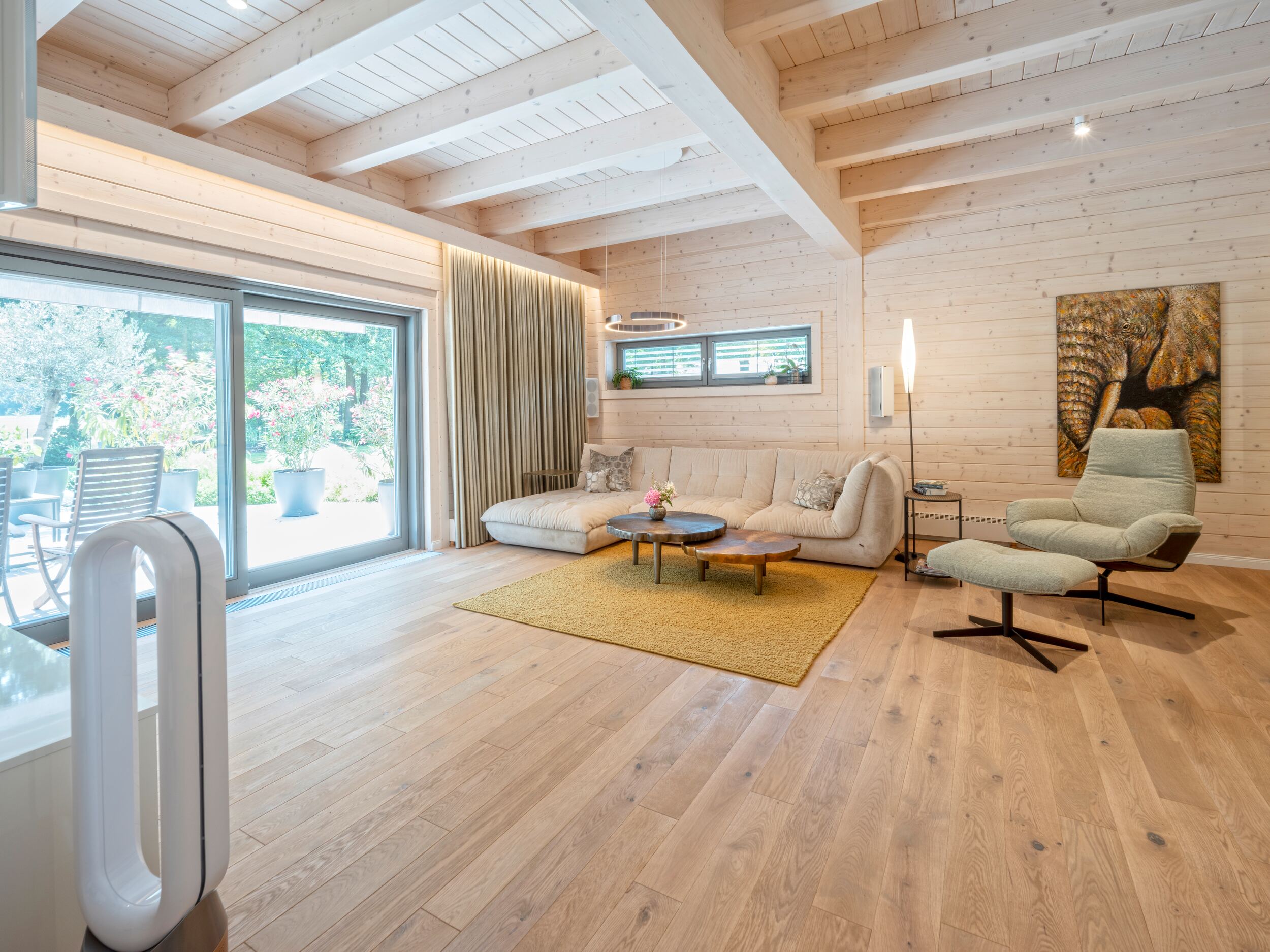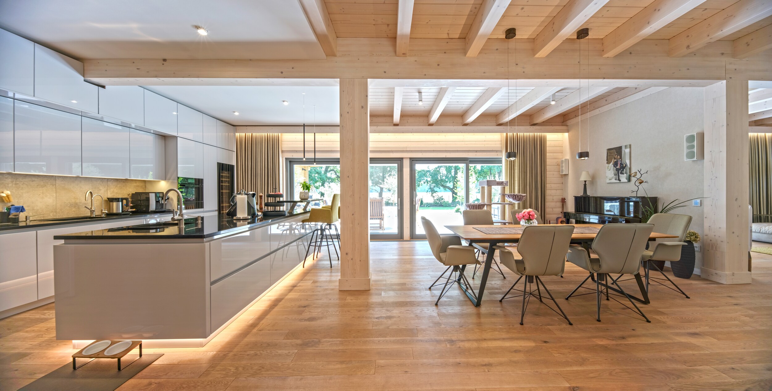 Obwohl dieses Blockhaus deutlich größer ist, als andere Häuser, zeigt sich das Wohnraumkonzept angenehm bodenständig. Ein Empfangsbereich begrüßt die Gäste beim Eintritt in das Massivholzhaus und leitet direkt weiter in die großzügige Küche mit Essbereich. Große Fenstertüren durchfluten hier den Innenraum mit Tageslicht und geben den Blick auf die gestaltete Gartenanlage frei. Sie werden wasserfallartig umrahmt von schweren Vorhängen, die in beige kaum auffallen. Überall dominieren erdige Farbtöne in Beige, Ocker oder Sand, die harmonisch aufeinander abgestimmt wurden. Akzente setzen die glänzendglatten Fronten der Küche und Anrichte sowie hochwertige Massivholzmöbel mit dunklem Edelstahlfuß. Der Übergang in den Wohnbereich ist dann fließend, der puristische Kaminofen in weiß dient als Raumtrenner.