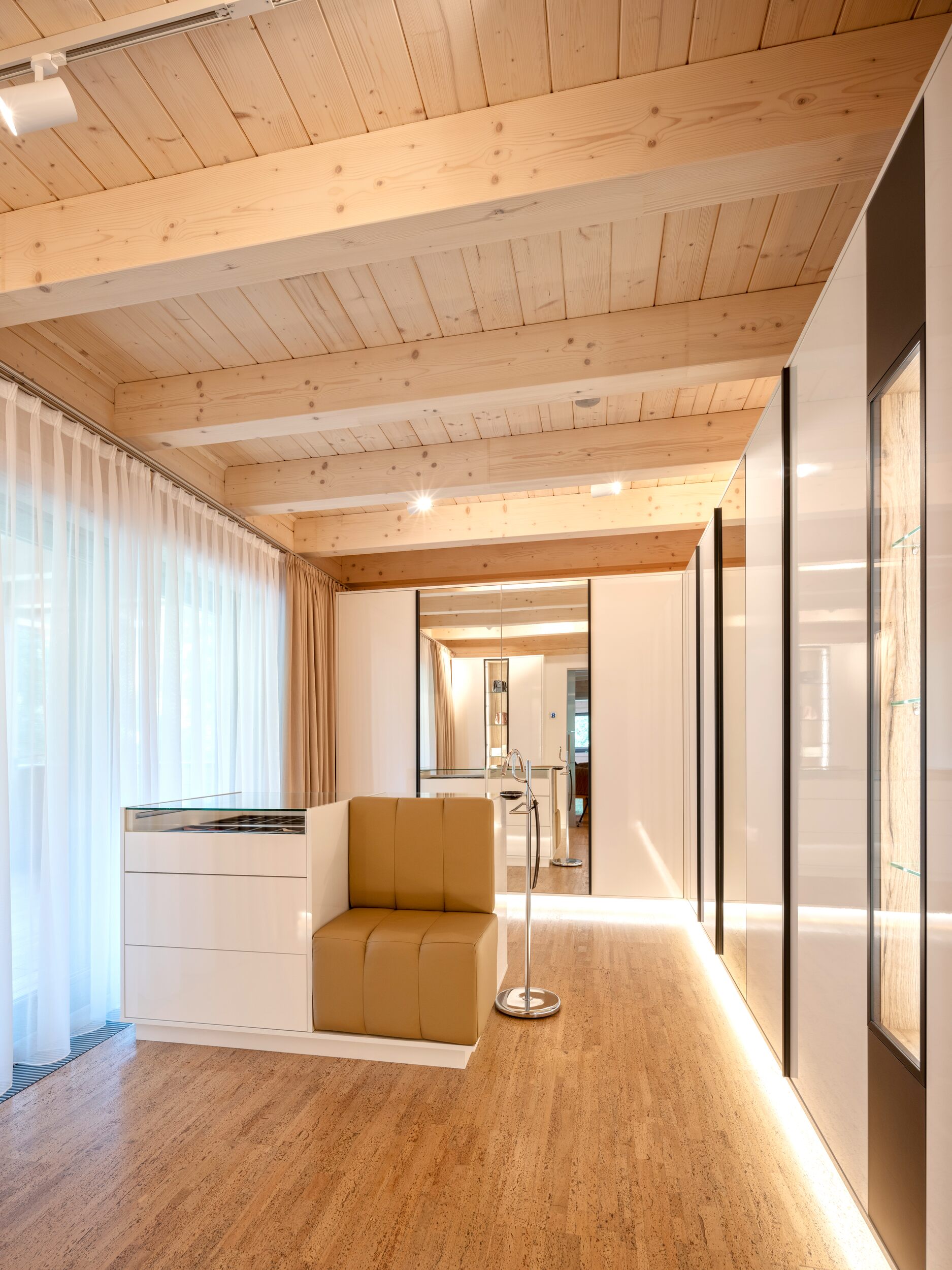 Auch hier setzt sich das gediegene Einrichtungskonzept fort: sanfte Farben und eine bewusst reduzierte Einrichtung versprühen ruhige Eleganz. Von hier gelangt man wieder zurück in den Empfangsbereich. Man läuft quasi im Kreis und erreicht alle Räume ohne lange Wege. Badezimmer, Hauswirtschaftsraum sowie ein Büro und eine praktische Speisekammer finden sich zusätzlich im Erdgeschoss des Haupthauses wieder. Das Obergeschoss ist dann zweigeteilt: das elterliche Schlafzimmer mit einer separaten Ankleide sowie ein Badezimmer schmiegen sich an die südliche Traufseite. Alle drei Räume haben durch große Terrassentüren Zugang zur vollüberdachte Loggia. Gegenüberliegend finden sich zwei Kinderzimmer, ein dazugehöriges Bad sowie ein kleiner Abstellraum.