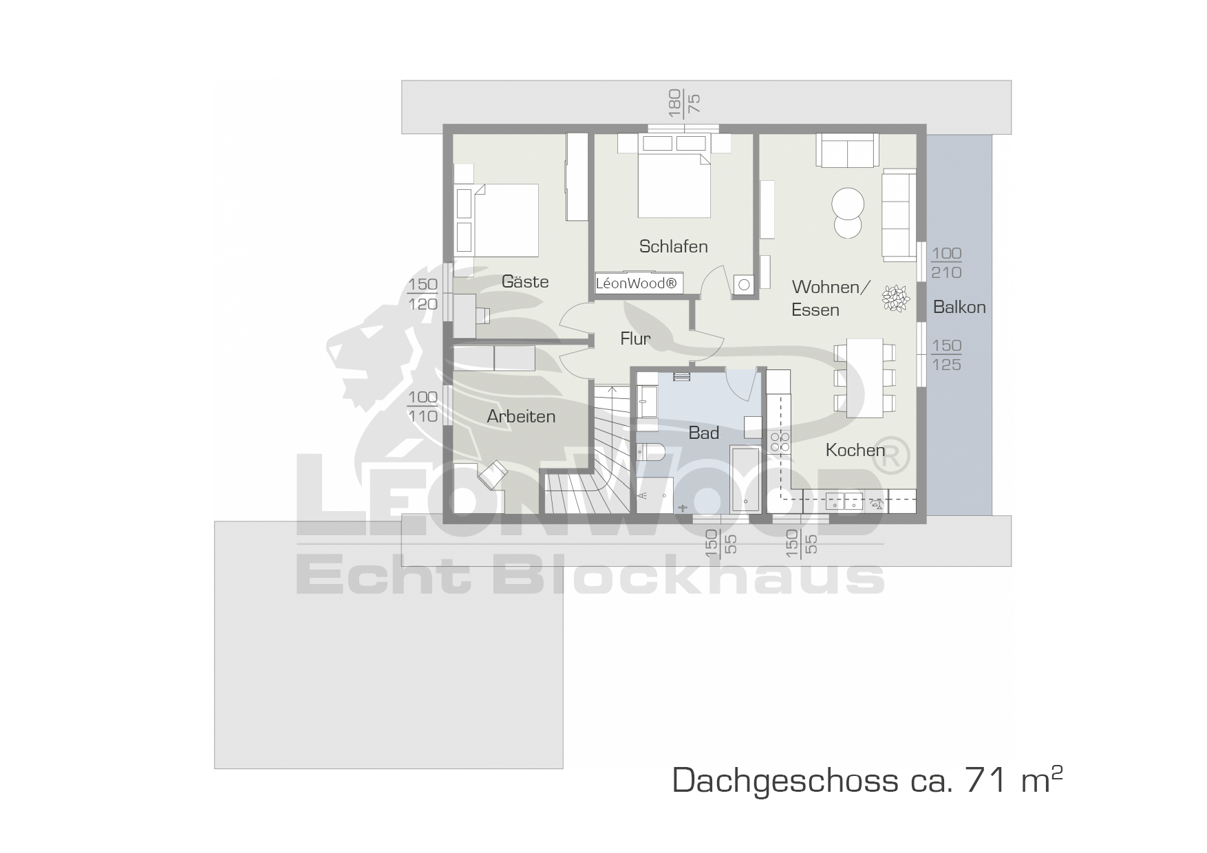 Ein spezielles D-Profil der Bio-Doppelwand® von LéonWood®, die bis unter das Dach verbaut wurde, unterstreicht zusätzlich die stattliche Eleganz des Blockbohlenhauses, das sich auf Wunsch selbstverständlich auch als Rundstammhaus realisieren lässt. Seine Vollendung findet das äußere Erscheinungsbild durch die Doppel-D-Ecke, die hier auf charmante Weise als Eckverbindung ihren Einsatz findet. Optional können auch andere Varianten ausgewählt werden. Die grundsätzlich verwendeten Naturmaterialien Holz und Kork sorgen im Inneren unserer Massivholzhäuser für ein einmaliges Wohnklima.