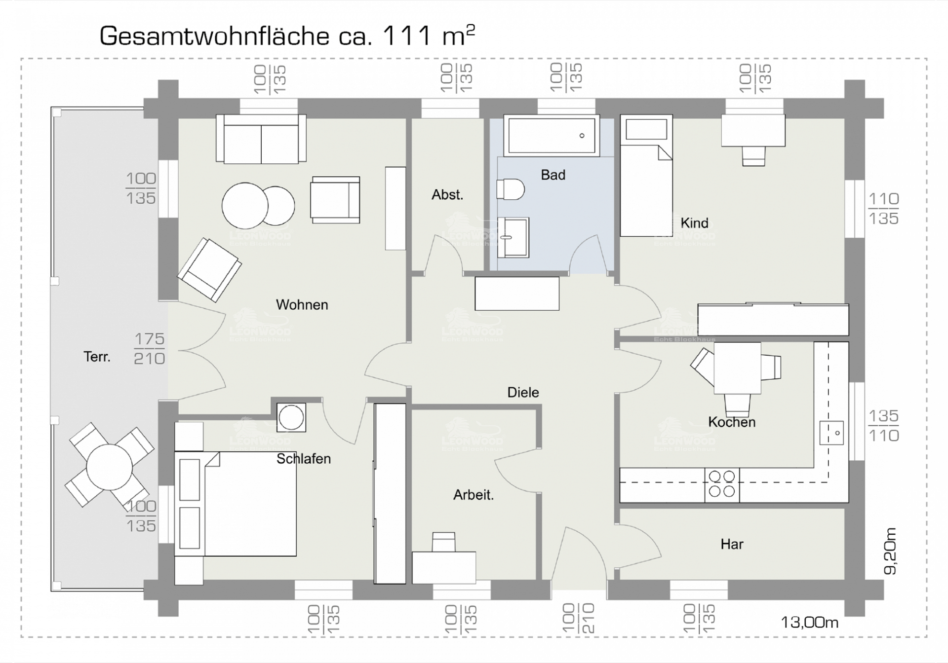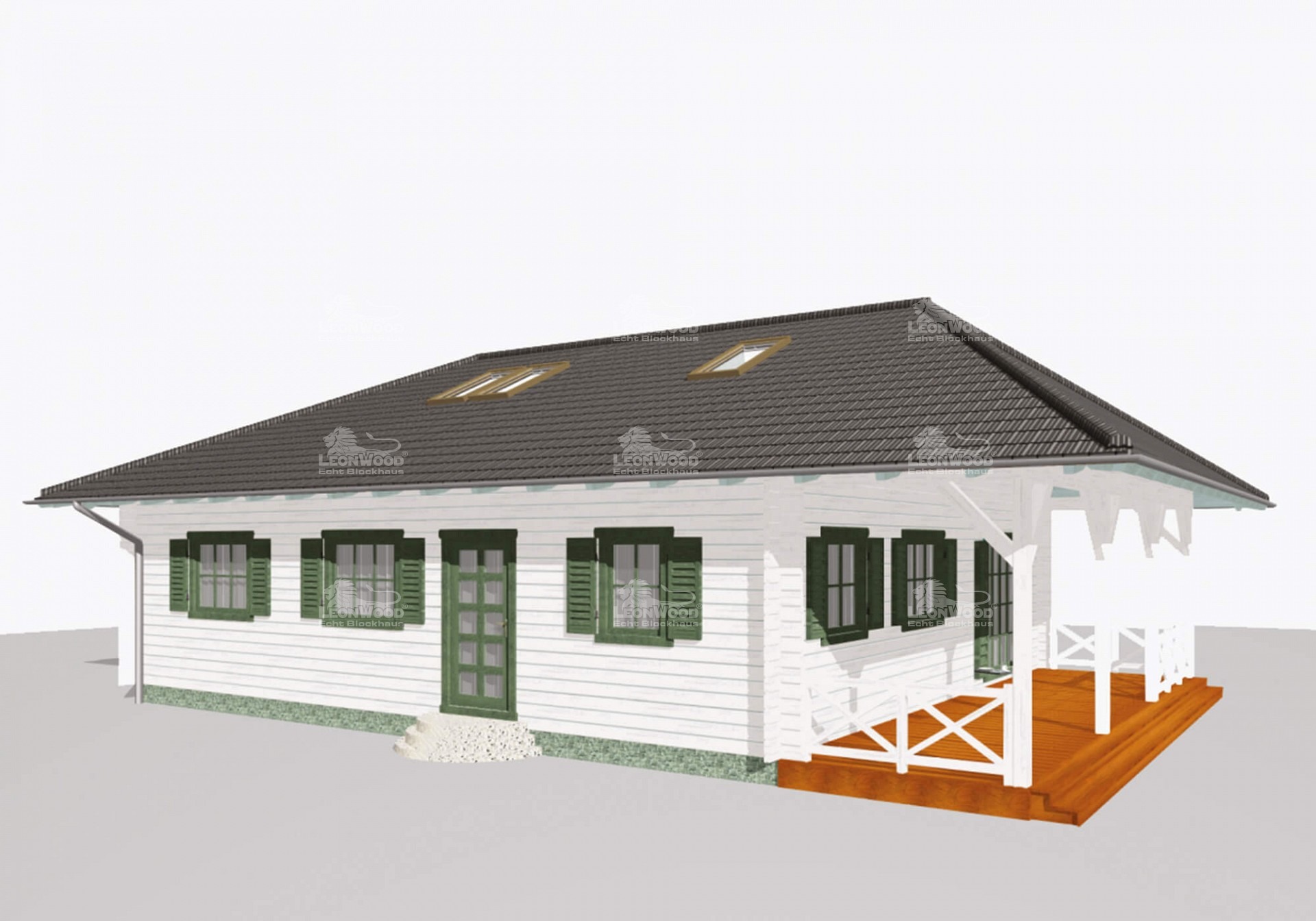 Beim Holzhaus „Classic 100“ handelt es sich um ein klassisches Holzhaus. Es zeichnet sich durch ein flach geneigtes Walmdach sowie eine einladende Veranda aus. Das einstöckige Haus im Blockhausbau kann mit einer Gesamtfläche von 98,5 m² oder mit 100 m² umgesetzt werden. Ganz nach Ihrem Geschmack und Bedarf lässt sich unter anderem die Raumaufteilung individuell gestalten. Wählen Sie beispielsweise die Variante mit offener Küche und angrenzendem Wohn-Essbereich für eine kommunikative Küchensituation. Wenn Sie allerdings eine Küche als eigenständigen Raum bevorzugen, ist auch diese Variante möglich.