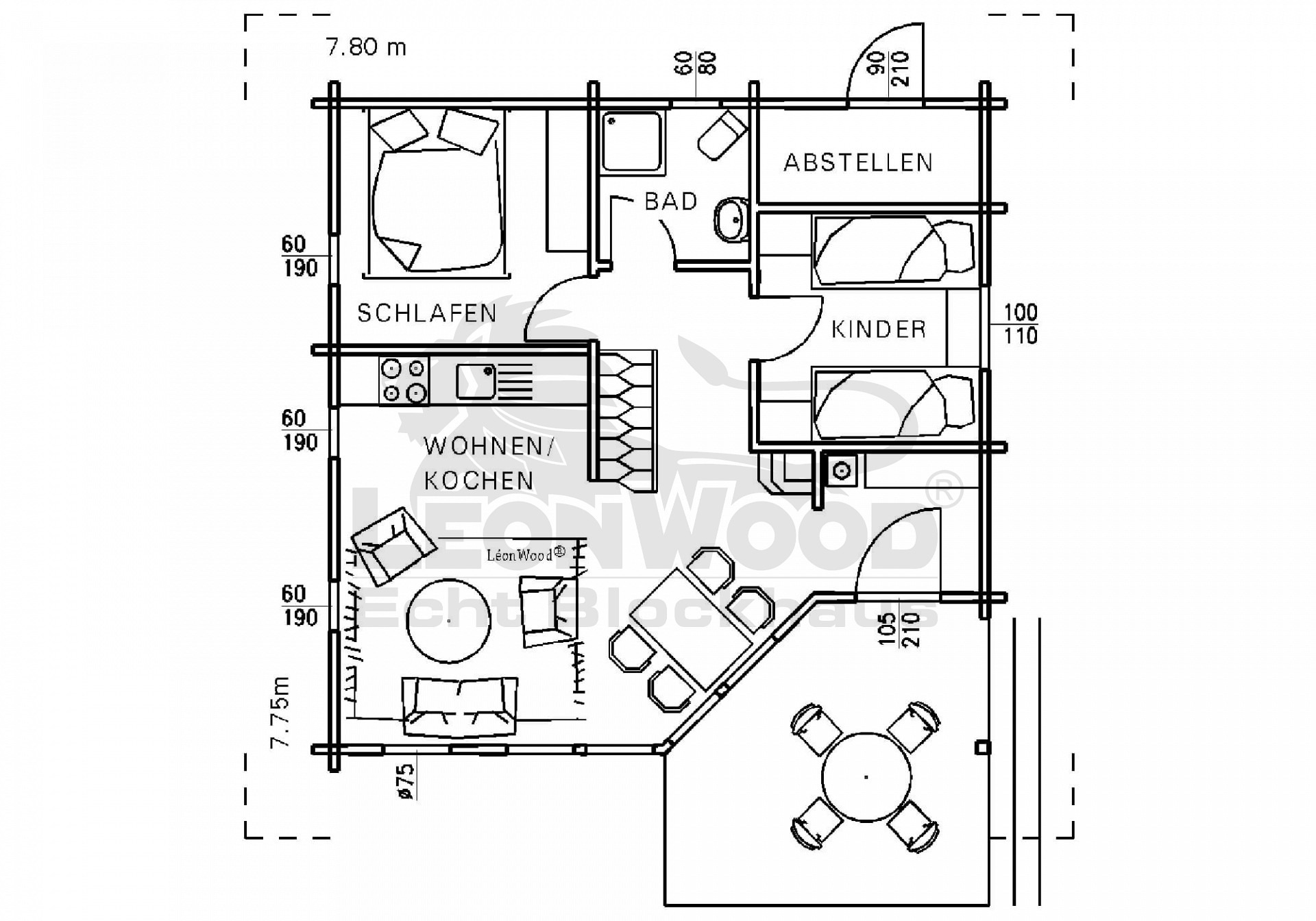 Beim „Leosun Adria 55“ handelt es sich um ein gemütliches Holzhaus mit einer Wohnfläche von 48 m², das ideal als Ferienhaus geeignet ist. Lassen Sie sich gerne vom hier dargestellten Grundriss, Design sowie der Raumaufteilung inspirieren, um eine Vorstellung von Ihrem Wunschhaus zu erhalten. Grundsätzlich ist im Blockhausbau mit LéonWood® eine freie Gestaltung innen wie außen möglich, sodass Sie sich in Zusammenarbeit mit uns Ihr persönliches Traumhäuschen individuell gestalten können.