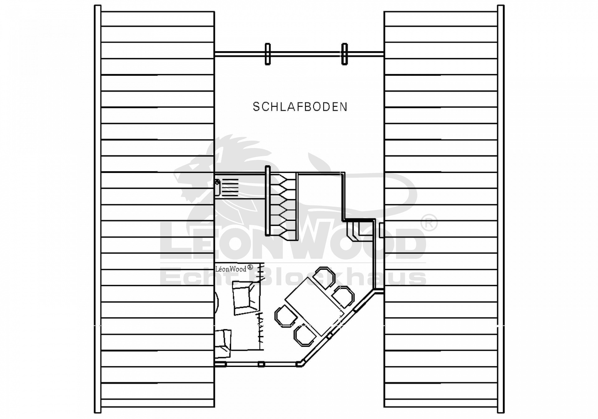 In diesem Blockhaus vereint sich der ganze Wohnbereich im Erdgeschoss. Hier befinden sich das Schlafzimmer für die Eltern, das Kinderzimmer mit Platz für zwei Betten und ein gemeinsames Bad mit Dusche. Der Wohn-Koch- und Essbereich ist offen und kompakt gestaltet, wodurch die ganze Familie viel Zeit miteinander verbringen kann. Durch eine breite Fensterfront gelangt viel Tageslicht in das Haus, was für lichtdurchflutete Wohnräume sorgt. Ebenfalls ist ein Abstellraum verfügbar, der von außen erreichbar ist. Dort können Sie vielerlei lagern, wie beispielsweise das Gartenspielzeug der Kinder, Ihren Grill und vieles mehr. Eine kleine gemütliche Terrasse lädt zum gemeinsamen Frühstücken bei gutem Wetter, schönen Spieleabenden oder der allgemeinen Entspannung ein. Das Besondere an dem Holzhaus ist, dass es im Obergeschoss über einen Schlafboden verfügt, auf dem die Kinder entspannen, aber auch toben können.