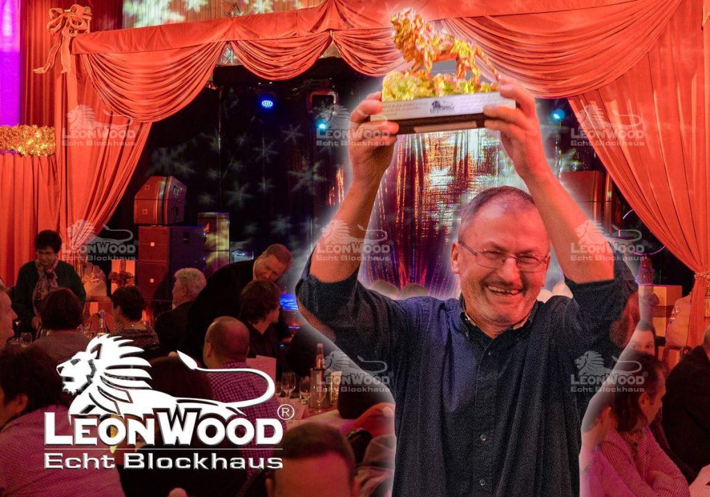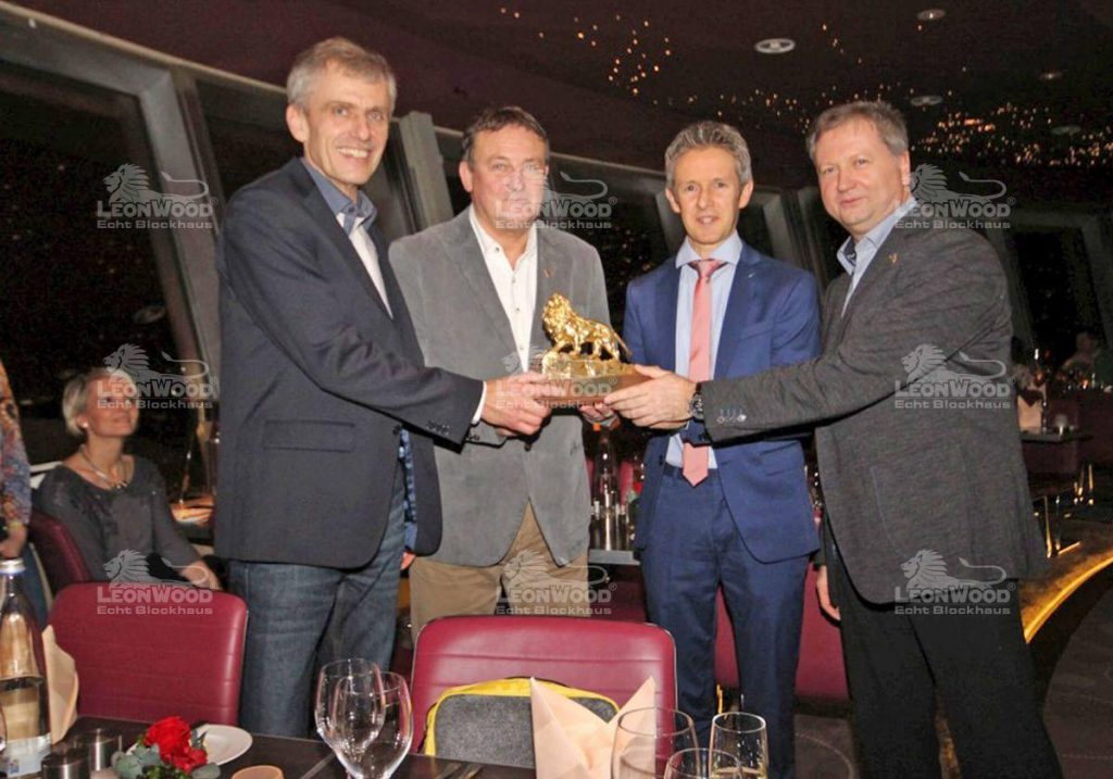 Feierliche Übergabe des goldenen Löwen für den besten LéonWood® – Fachberater für das Jahr 2014 durch Geschäftsführer Dieter Schenkling, Jens Weißflog und Verkaufsleiter Heiko Jost …