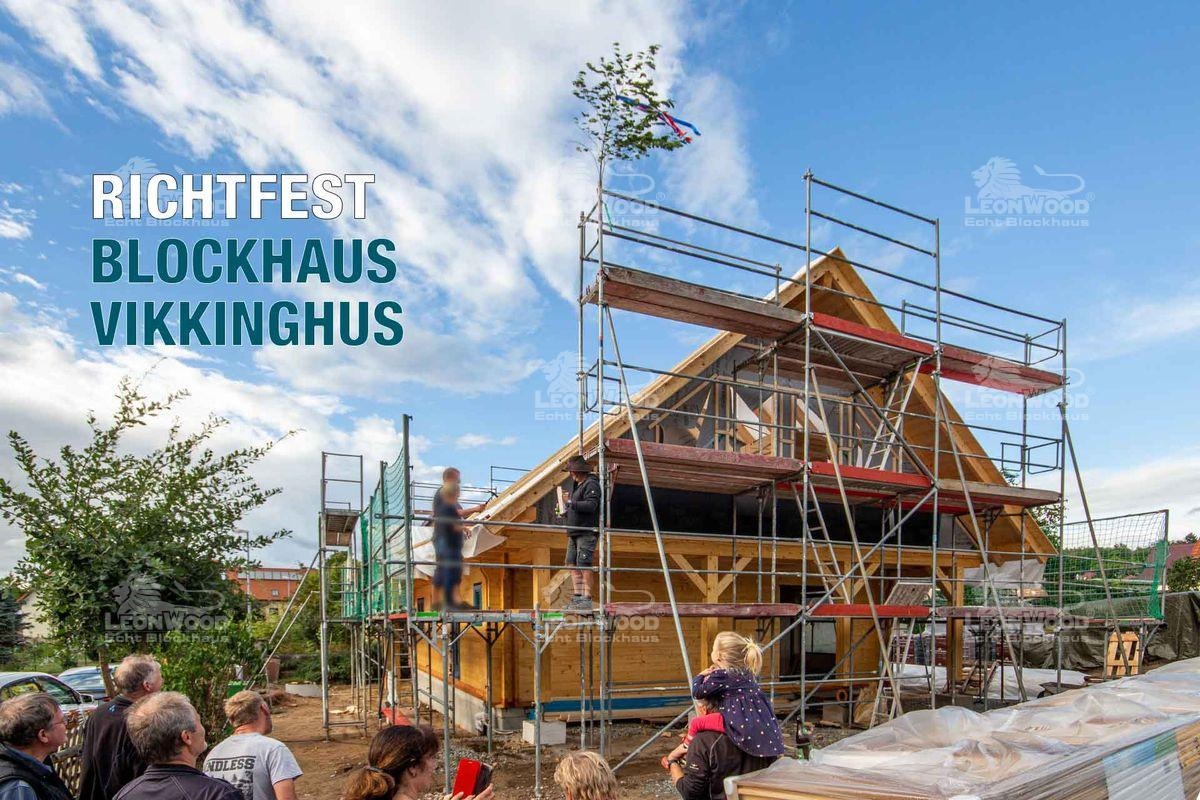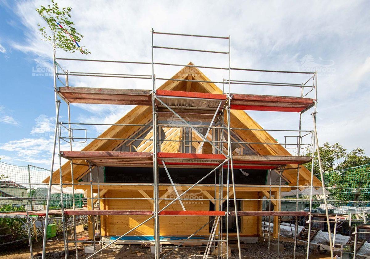 Fröhliches Richtfest eines skandinavischen Blockhauses bei Dresden