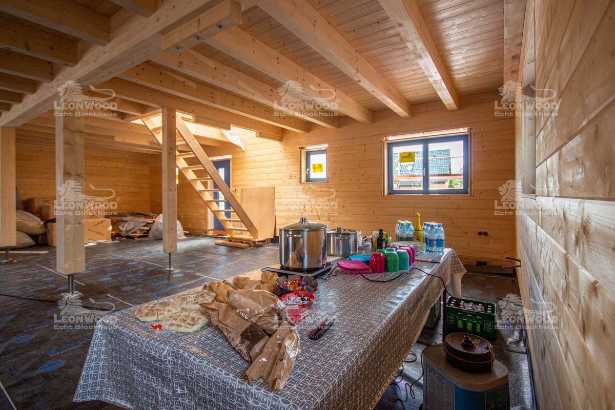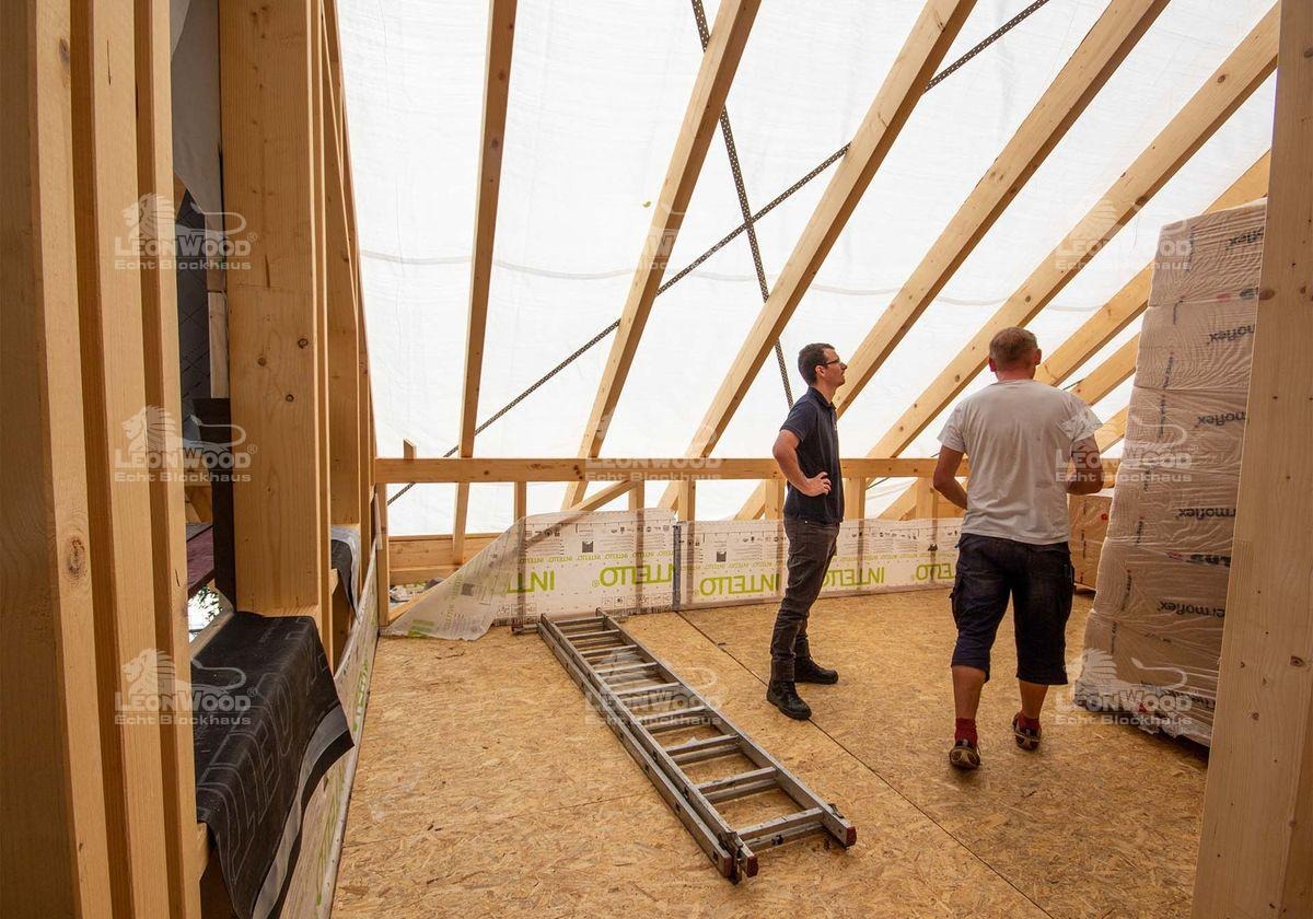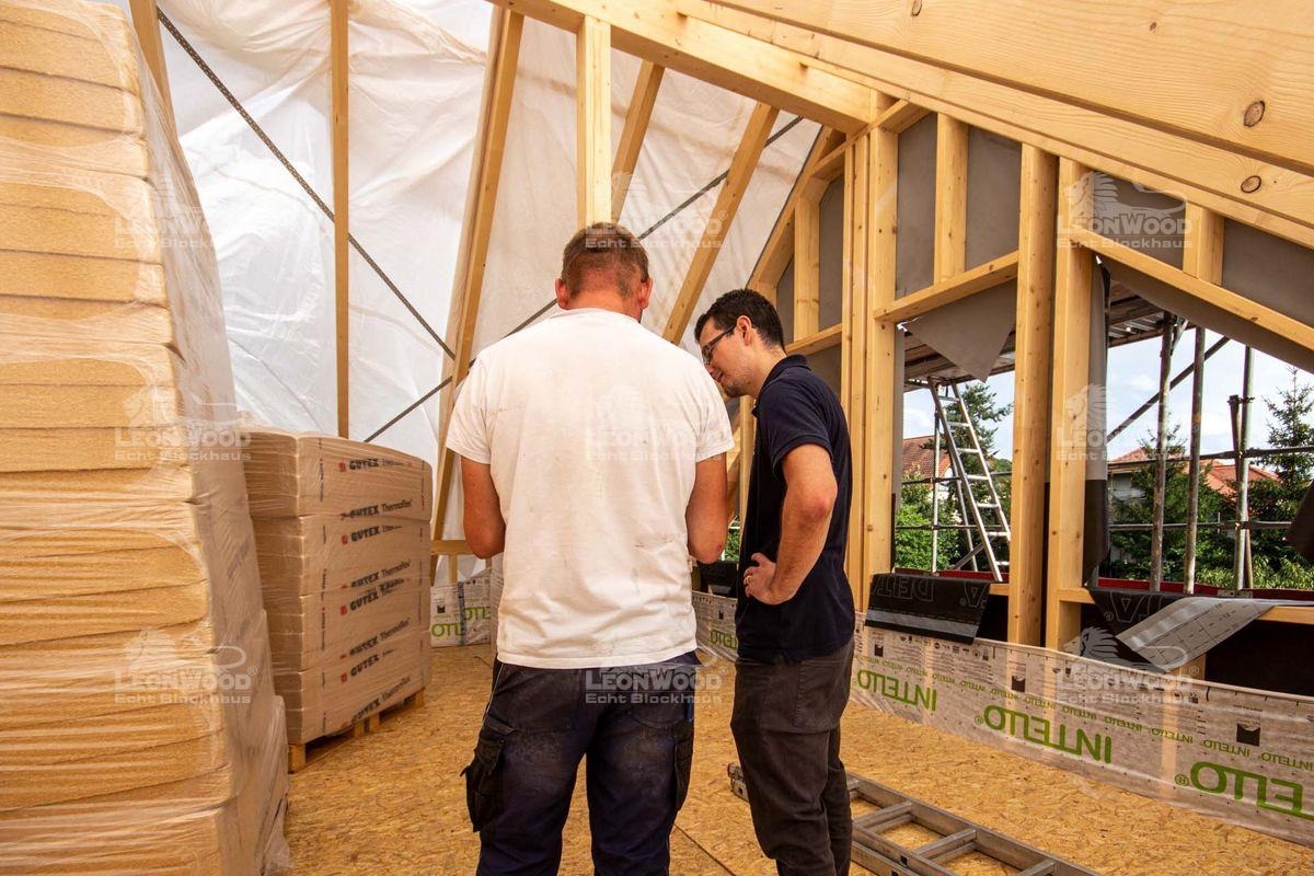 Auch als wir auf der Baustelle ankamen, zimmerten Bauherr B., Richtmeister Miserski und seine Helfer noch emsig am Giebel des Hauses. Nach einer herzlichen Begrüßung des Bauherrn gab es für Projektleiter Chris Juhl eine Haus-Rundführung. Es wurde gefachsimpelt, sich ausgetauscht und Fragen geklärt. Probleme gab es bei dieser Baustelle aber nicht wirklich. „Die Lieferung kam pünktlich an. An diesem Tag haben wir schon die ersten drei Lagen gesetzt. Der Richtermeister meinte, dass er das so gar nicht kennt, dass alles so schnell, reibungslos und schnell läuft“, lacht Herr B. Seine Frau kann dem nur zustimmen: „Also es hat echt alles, nicht nur bei LéonWood®, sondern auch so alles perfekt gepasst! Wir haben den Liefertermin ein bisschen später gekriegt, als wir ursprünglich angedacht hatten. Das hat uns aber Zeit gegeben, alles so rund zu machen.“