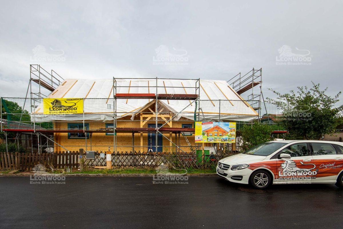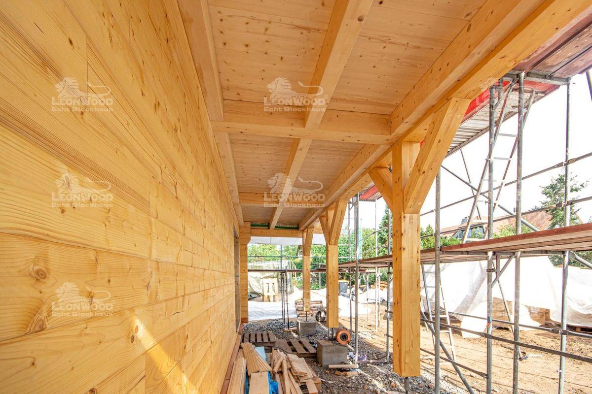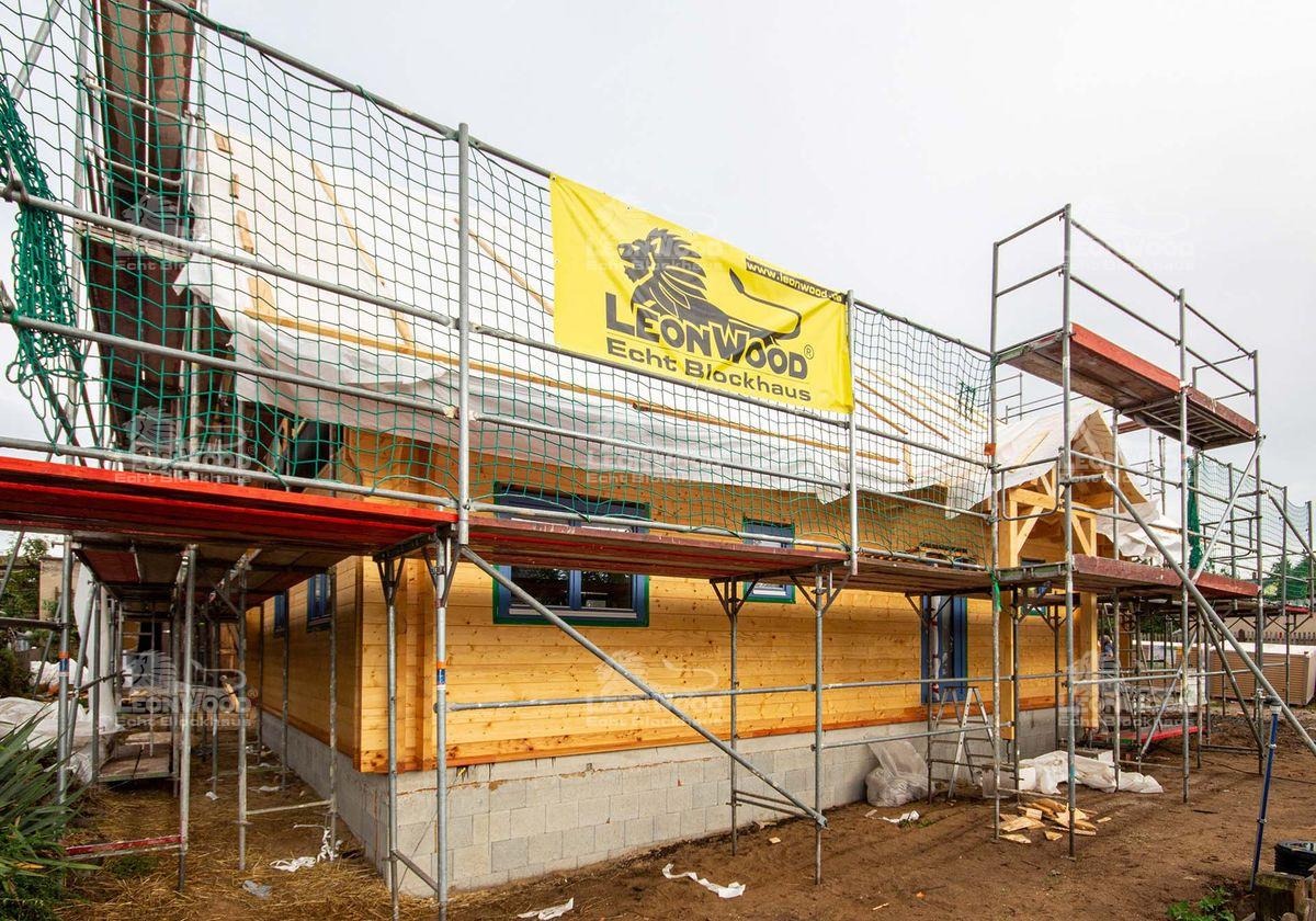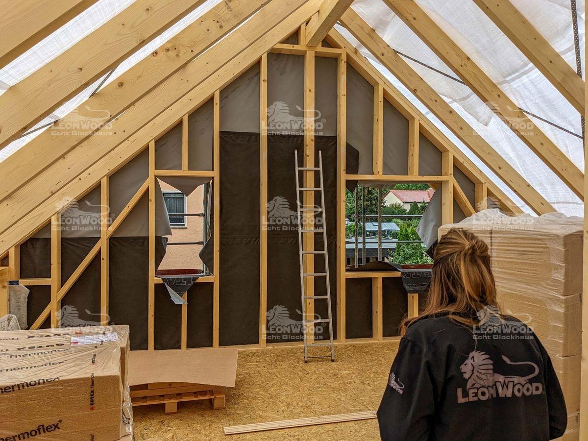 Auch als wir auf der Baustelle ankamen, zimmerten Bauherr B., Richtmeister Miserski und seine Helfer noch emsig am Giebel des Hauses. Nach einer herzlichen Begrüßung des Bauherrn gab es für Projektleiter Chris Juhl eine Haus-Rundführung. Es wurde gefachsimpelt, sich ausgetauscht und Fragen geklärt. Probleme gab es bei dieser Baustelle aber nicht wirklich. „Die Lieferung kam pünktlich an. An diesem Tag haben wir schon die ersten drei Lagen gesetzt. Der Richtermeister meinte, dass er das so gar nicht kennt, dass alles so schnell, reibungslos und schnell läuft“, lacht Herr B. Seine Frau kann dem nur zustimmen: „Also es hat echt alles, nicht nur bei LéonWood®, sondern auch so alles perfekt gepasst! Wir haben den Liefertermin ein bisschen später gekriegt, als wir ursprünglich angedacht hatten. Das hat uns aber Zeit gegeben, alles so rund zu machen.“