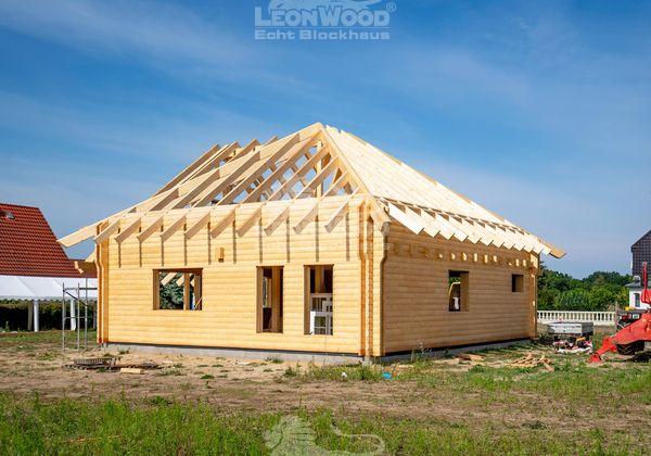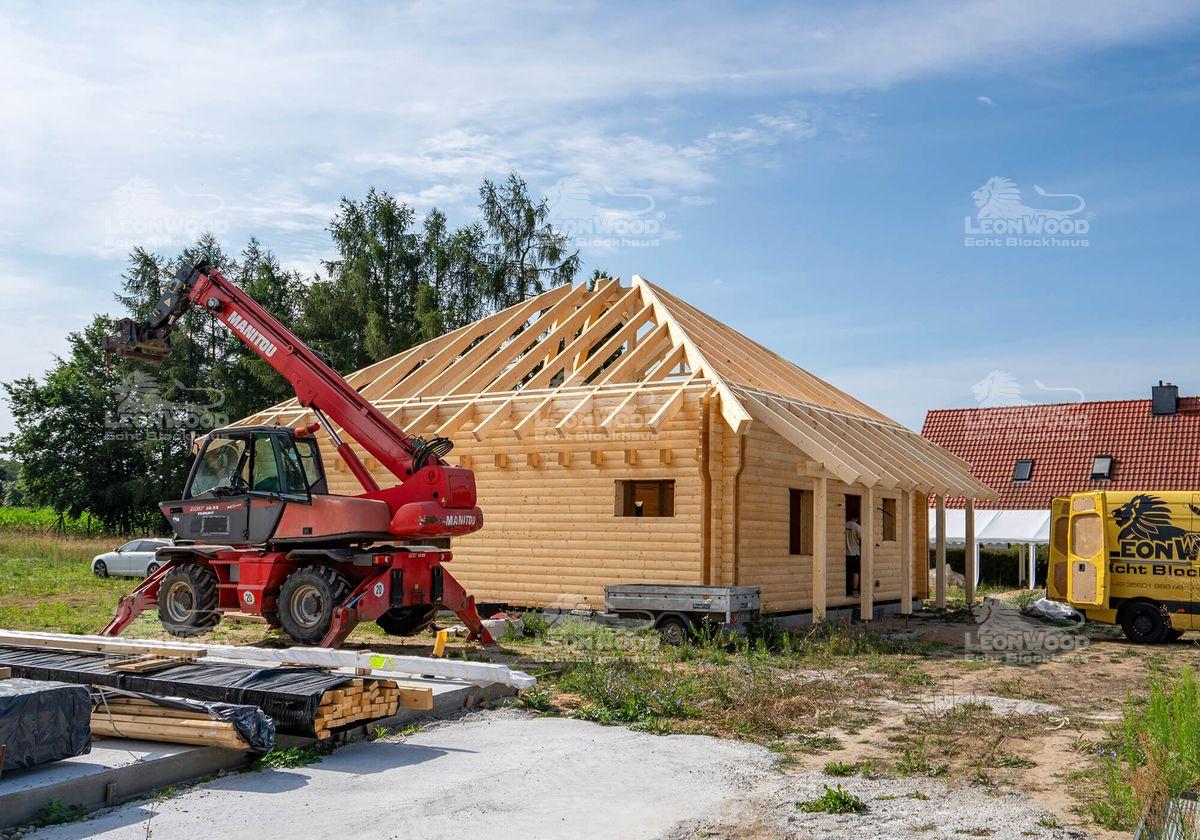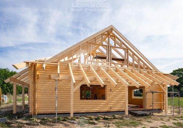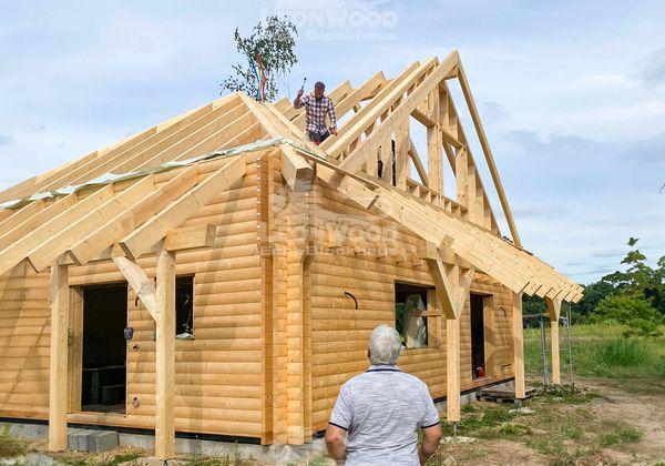 Damals bei LéonWood® hat Johannes so einige Projekte betreut und konnte sich so schnell auf einen Haustypen sowie eine Wandvariante festlegen: „Das Alaska ist einfach das schönste Haus für mich“, sagt er. „Ein großer Dachüberstand, ein schönes Walmdach, eine überdachte Terrasse… Ich möchte später meine Mahlzeiten draußen genießen und sollte doch mal ein Tröpfchen Regen fallen, dann kann man hier bequem sitzen.“ Der konstruktive Holzschutz ist für den gelernten Zimmermann ebenfalls sehr wichtig: „Der erklärte Feind eines Holzhauses ist das Wasser. Und um Wasser abzuhalten, brauchen wir große Dachüberstände. Das Alaska bietet nun mal diesen Komfort.“ Die große Satteldachgaube hat er individuell hinzugefügt, „ein Highlight“, wie er findet. Auf die haustypische Galerie mit Luftraum hat er bewusst verzichtet und dafür mehr Wohnraum eingeplant: „Da haben die Kinder später jede Menge Platz im Obergeschoss.“ Auch die äußere Bohle der BIO-Doppelwand® hat er mit dem D-Profil für sich individualisiert: „Unter einem Blockhaus verstehen die meisten ein Rundstammhaus. Und das D-Profil gibt die Möglichkeit, einen Rundstamm anzudeuten“, erklärt er. „Und durch den dreischaligen Aufbau inklusive Korkdämmung erreiche man einen optimaleren Wärmedurchgangskoeffizienten. Die Wärme bleibt mehr im Haus bzw. die Kälte draußen.“