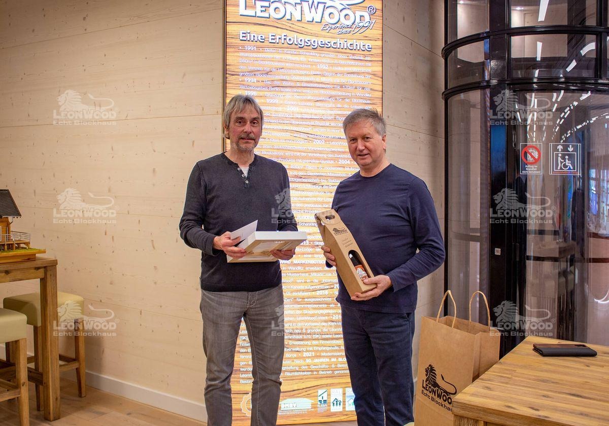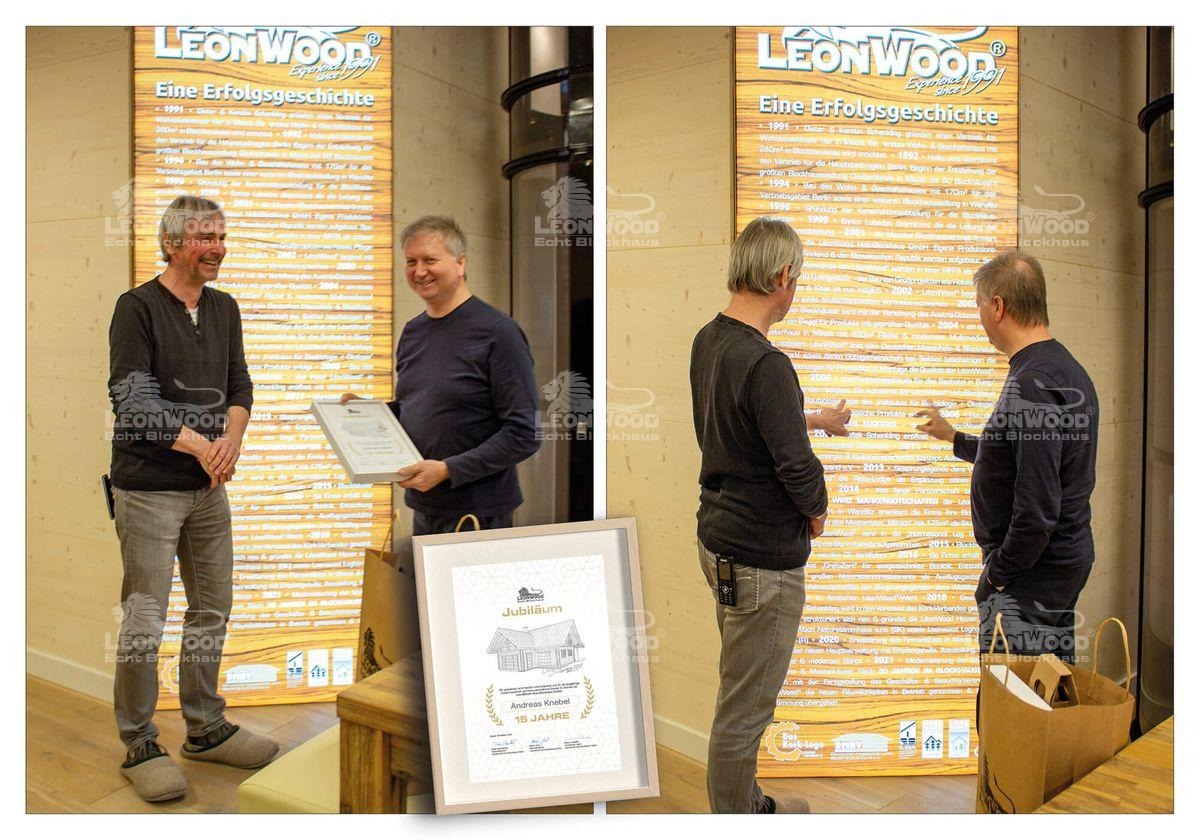 Erfahrungswerte, die auch LéonWood®-Geschäftsführer Dieter Schenkling zu schätzen weiß: „Die 15 Jahre Erfahrungen im Blockhausbau bei uns beweisen nicht nur die Loyalität von Herrn Knebel, sondern auch sein gewachsenes Vertrauen in einen natürlichen, unkomplizierten Baustoff. Dadurch, dass er vorher im Massivbau gearbeitet hat, kennt nur Herr Knebel die wahren Unterschiede und kann damit die qualitative Überlegenheit von Holz- und Blockhäusern gegenüber herkömmlichen Bauweisen bestätigen. Dies ist eine echte Bereicherung für uns.“ Zum Betriebsjubiläum überreichte Dieter Schenkling an Andreas Knebel neben einer Urkunde und echtem LéonWood®-Wein, auch einen Gutschein für einen Buchhandel als kleine Aufmerksamkeit.