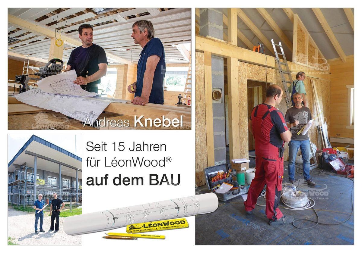 Mit über 15 Jahren Betriebszugehörigkeit ist Andreas Knebel bereits ein alter Hase bei LéonWood®. Knebel ist Bauleiter, kümmert sich um die Planung und Koordinierung der Gewerke vor, während und nach einem Bauvorhaben. Dabei steht er immer in engem Kontakt mit den Konstrukteuren, Richtmeistern und natürlich den Bauherren. Neben unzähligen Privathäusern, hat Knebel auch Großprojekte betreut – darunter das Hotel LéonWood® im Lido Senftenberg oder das neue Geschäfts- und Besucherzentrum von LéonWood®. „Wenn man die Entwicklung seit so langer Zeit miterleben durfte, bemerkt man schnell, dass es immer ein neues Ziel gibt“, sagt er.