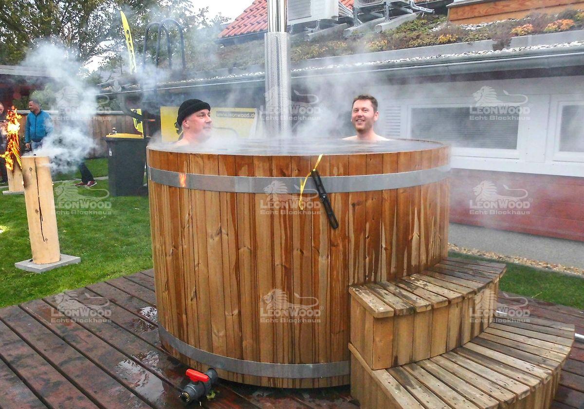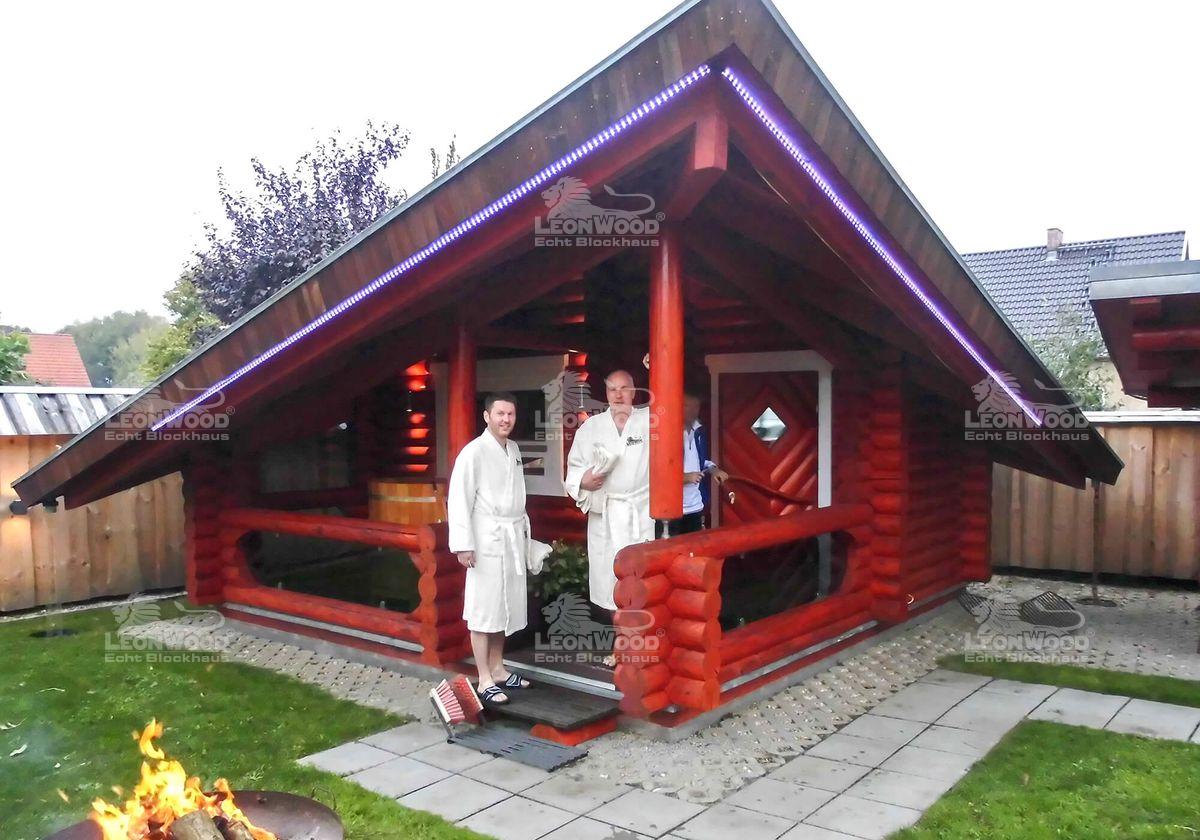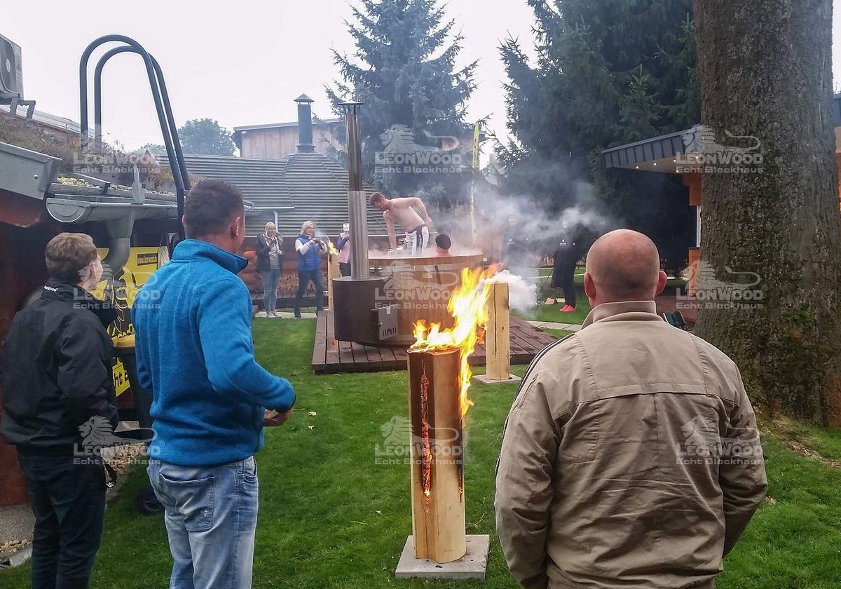 Finnisches Herbstfest bei LéonWood®: Herbstzeit ist Saunazeit! Die kalte Jahreszeit beginnt, Zeit für wärmende Saunagänge und gemütliches Glühweintrinken am Lagerfeuer. Blockhaus-Experte LeonWood® kann seinen Kunden seit diesem Herbst nun auch seine fertig gestellte Zubehörreihe TOP of BLOCK life und in Farbe als Muster-Außenanlagen präsentieren. Um dies gebührend einzuweihen, lud die Geschäftsführung rund um Dieter Schenkling die Mitarbeiter zu einem kleinen finnischen Herbstfest. Letzterer ließ es sich nicht nehmen, die neuen Außenanlagen rund um die gemütliche Grillkota und das Blockhaus-Saunahäuschen gemeinsam mit Partner Heiko Jost und Technikleiter Enrico Lobedan selbst zu testen.