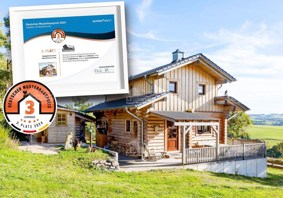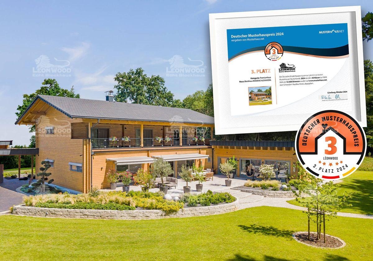 Beim Deutschen Musterhauspreis 2024 erreichte das Blockhaus „Residenz Alexandra“ in der Kategorie „Premiumhaus“ den dritten Platz. Das Haus überzeugt mit einem integrierten Home-Spa, einem durchdachten Wohnkonzept und 450 m² Wohnfläche. In der Kategorie „Newcomer“ sicherte sich das Blockhaus „Husky“ ebenfalls den dritten Platz. Besonders die außergewöhnliche Architektur mit dem markanten Dach trug zu dieser Auszeichnung bei.