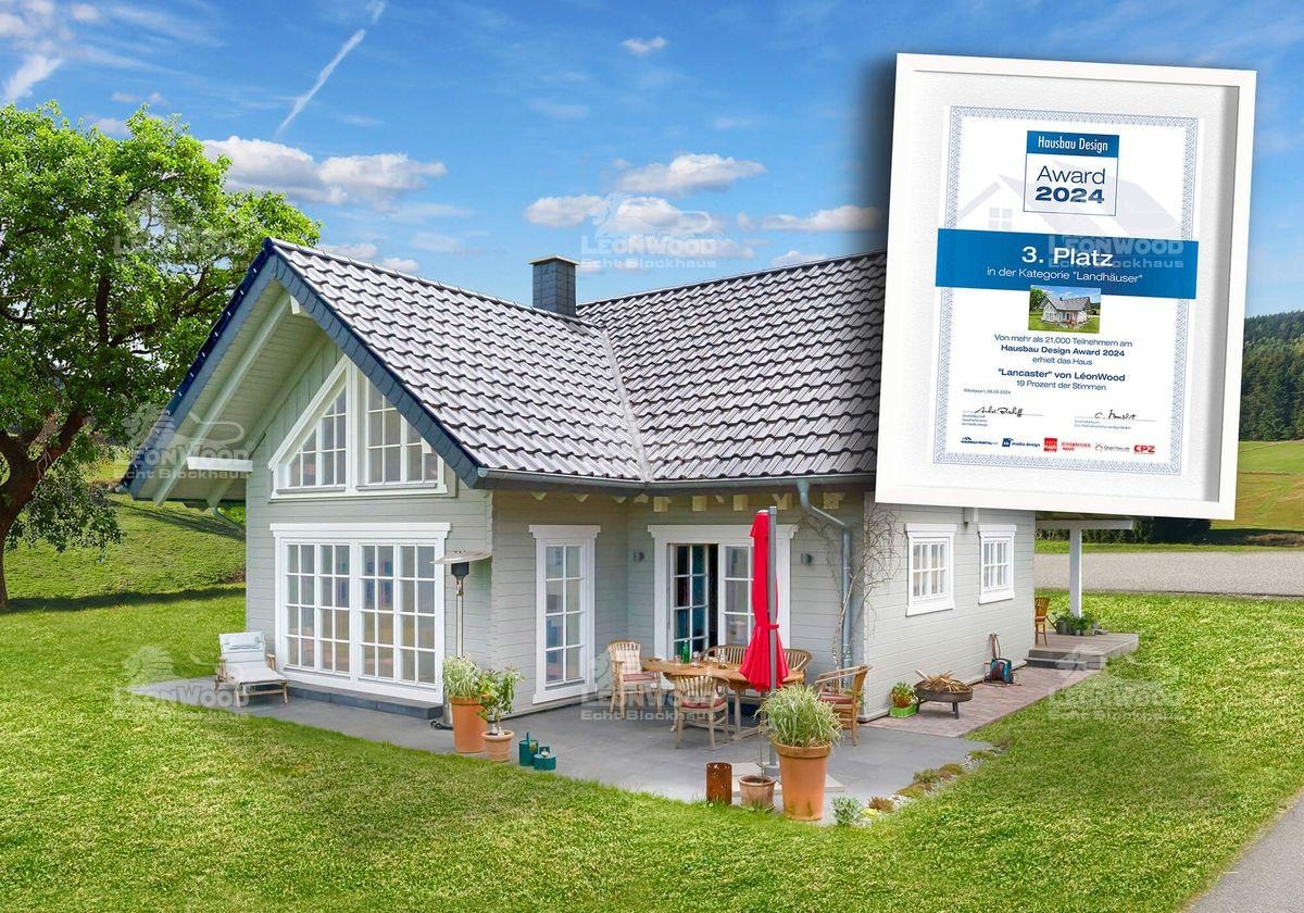 Auch beim Hausbau Design Award des CPZ-Verlags wurde das Blockhaus „Lancaster“ in der Kategorie „Landhäuser“ mit dem dritten Platz gewürdigt. Prägend sind hier der großflächige Glasgiebel sowie die spürbare englische Landhaus-Romantik.