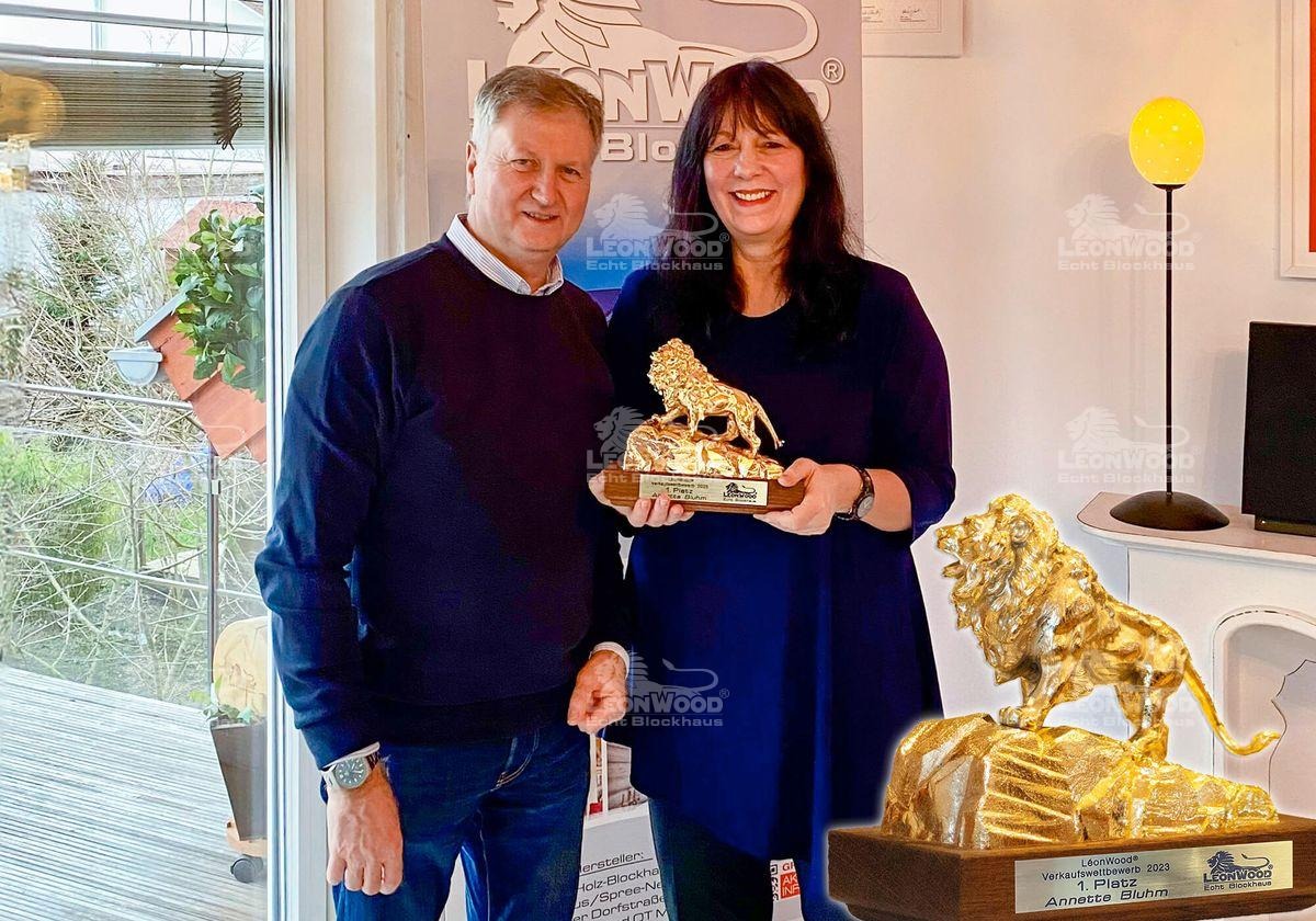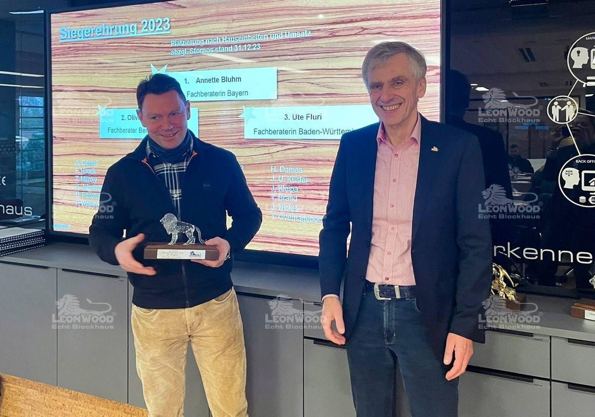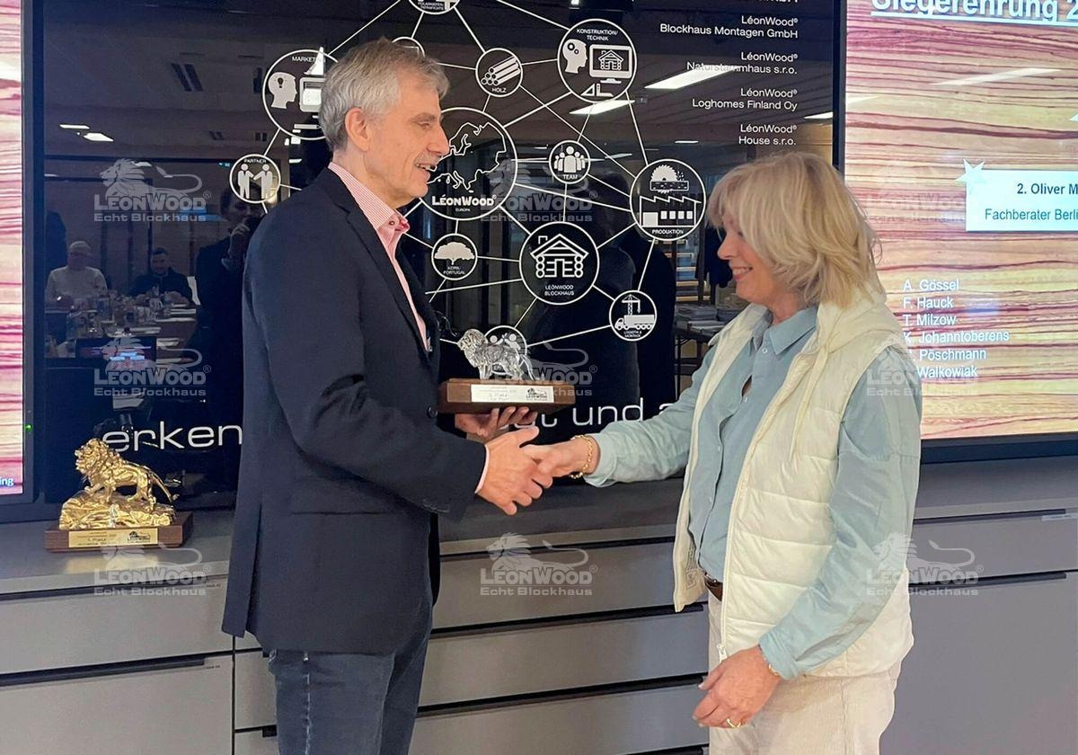 Über den zweiten Platz im Ranking konnte sich Fachberater Oliver Mildner freuen, der seine Interessenten vom Geschäfts- und Besucherzentrum am Stammsitz in Maust berät. Die Baden-Württembergerin Ute Fluri begeistert ihre Interessenten mit ihrem LéonWood®-Blockhaus im Schwarzwald. Sie konnte für sich Platz Drei erringen und erhält dafür, genau wie Oliver Mildner, von Heiko Jost den Gläsernen Löwen von LéonWood®. Herzlichen Glückwunsch!